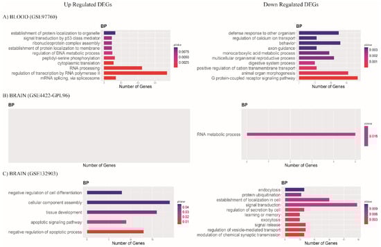 Bar plots show biological process (BP) and most enriched GO terms with p-value < 0.05. Color scale represents p-value; X axis indicates number of genes in each GO term. Data of (A) blood GSE97760, (B) brain database GSE84422-GPL96, and (C) brain database GSE132903.
