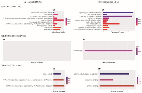 Bar plots show molecular functions (MFs); most enriched GO terms with p-value < 0.05. Color scale represents p-value; X axis shows the number of genes in each GO term. Data of (A) blood database GSE97760, (B) brain database GSE84422-GPL96, and (C) brain database GSE132903.