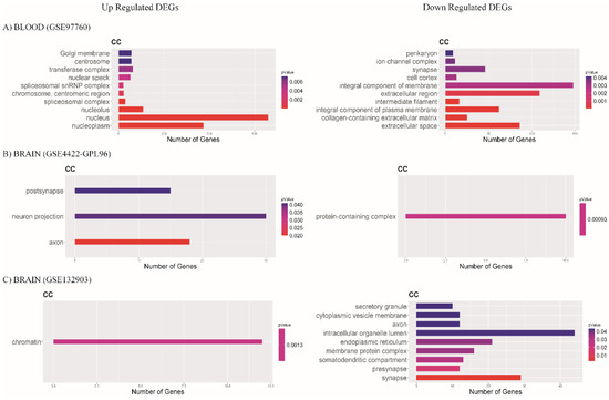 Bar plots show cell components (CC); most enriched GO terms with p-value < 0.05. Color scale represents p-value; X axis shows the number of genes in each GO term. Data of (A) blood database GSE97760, (B) brain database GSE84422-GPL96, and (C) brain database GSE132903.