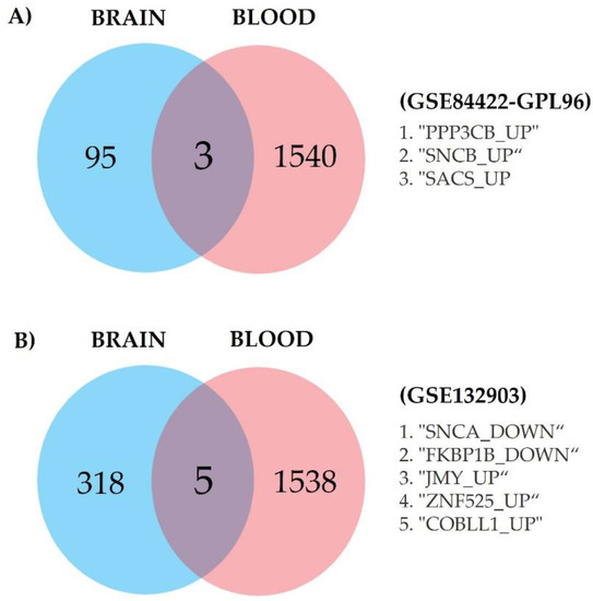We looked for the intersection of genes between the two brain databases and the blood database, which are of great interest as potential AD biomarkers for blood tests. We found genes of interest in common (shared between the blood and brain databases) with the same expression pattern (up- or downregulated) between the blood and brain datasets. As mentioned in Section 2, the blood database (GSE97760) was analyzed with the two brain databases (GSE84422-GPL96 and GSE132903). In the first intersection between the blood database (GSE97760) and one of the brain databases (GSE84422-GPL96), we found three genes of interest, namely, PPP3CB, SNCB, and SACS, and all were upregulated (Figure 8A). Five genes of interest were found for the intersection between the blood database (GSE97760) and brain database GSE132903: SNCA, FKBP1B, JMY, ZNF525, and COBLL1 (Figure 8B).