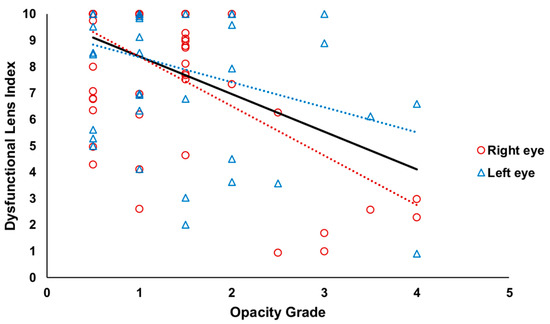 Scatter plot of the relationship between Dysfunctional Lens Index and Opacity Grade. Black, red, and blue lines indicate the tendency lines of all, right, and left eyes, respectively.