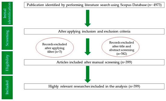For this analysis, an electronic search was performed in December 2021, using Elsevier’s Scopus database (https://www.scopus.com). The search subject was typed as “salivary biomarkers” and then added to the source title section. Authors carefully screened the titles and abstracts of prospective publications related to salivary biomarkers. From 582 retrieved papers, 399 were selected based on suitability (Figure 1). As this research did not involve any human or animal interaction, no ethical approval was obtained for this analysis.