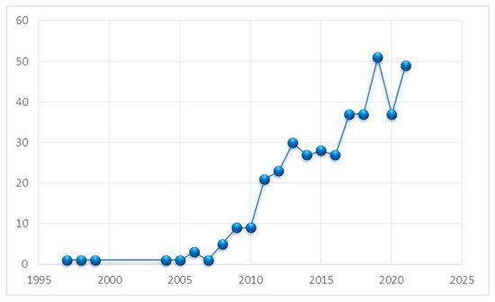 The results of our analysis revealed that from 1997 to 2010, the number of articles published on salivary biomarkers was relatively small (Figure 2). In 2011, 21 papers were published, while in 2012, 23 papers were published, showing that researchers developed a strong interest in this field. Similarly, in 2013, 30 papers were published, while in 2017 and 2018, 37 articles were published, respectively. The highest numbers of papers were published in 2019, with 51 publications, while in 2021 (up to December), 49 papers were published.