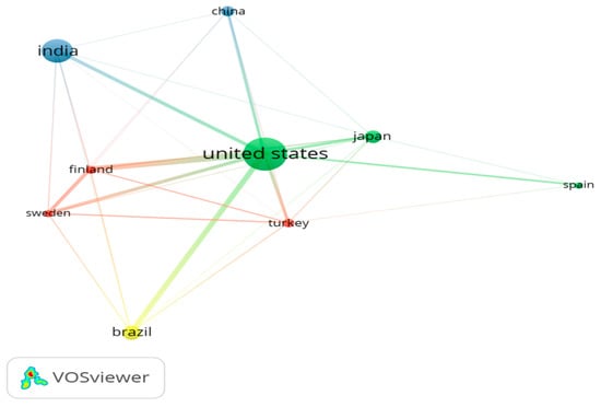 Table 1 identifies the leading countries that published the highest number of papers related to salivary biomarkers. The United States (U.S.) published the highest number of papers (84) and received the highest citations (3778), followed by India and Brazil, which published 60 and 36 articles, respectively. Concerning citations, India (1011) and Japan (627) received the highest citations after the U.S. (Table 1). In the current analysis, Figure 3 identifies a collaborative network among countries that collaborated for salivary biomarker-related research.