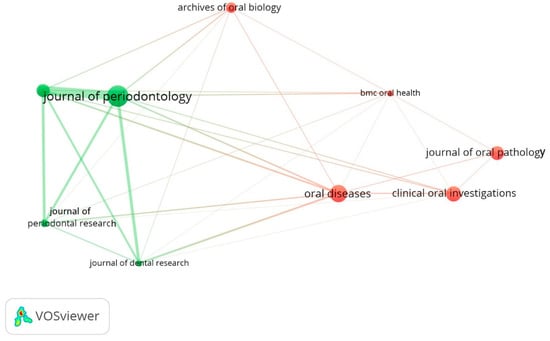 Table 2 exhibits the top journals that contributed to the domain of salivary biomarkers. The Journal of Periodontology published the highest number of articles (39) that received the highest citations (1247). The Journal of Oral Diseases and the Journal of Clinical Oral Investigations published 32 and 27 papers, while receiving 1083 (second highest) and 402 citations, respectively. Interestingly, the Journal of Clinical Periodontology only published 23 articles, but received 865 citations (third highest) (Table 2). In this analysis, Figure 4 illustrates the leading journals that have contributed to the domain of salivary biomarkers.
