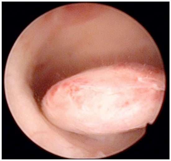 Similarly, Garuti et al. [42] used the terms “hysteroscopy” and “hysteroscopic view” interchangeably, reporting a low sensitivity (0.64 and 0.61) and specificity (0.92 and 0.95) for the diagnosis of endometrial hyperplasia. In the study of De Franciscis et al. [43], the concordance between the final histopathological result and the hysteroscopic impression was 86% for benign disease or normal endometrium, but only 58% for endometrial hyperplasia. In addition, the lowest agreement (52%) was noted for postmenopausal endometrial hyperplasia. When restricted to women with postmenopausal AUB, the sensitivity and specificity of in-office hysteroscopy for endometrial hyperplasia (with histopathology as reference) was 87% and 43%, respectively [43]. In contrast, Tinelli et al. [44] not only confirmed the diagnostic superiority of hysteroscopy with an eye-directed biopsy for detecting endometrial pathologies compared to TVS (and thus recommended hysteroscopy for all postmenopausal women with AUB and endometrial thickness > 4 mm) but also demonstrated the unique efficiency of hysteroscopy for diagnosing focal abnormalities (including EC) in the atrophic endometrium that would otherwise likely be missed by TVS. The authors advocate hysteroscopic evaluation even in patients with AUB with endometrium on TVS of <4 mm, aiming to decrease the chance of failing to diagnose carcinomas that develop focally in the atrophic endometrium (Figure 3) [44].