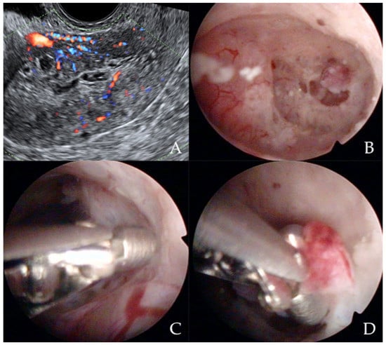 Ultrasonographic appearance of uterine lesion suspected for early-stage endometrial cancer (A). The diagnostic hysteroscopic allows for visualizing the suspected uterine area (B) and for obtaining the histologic biopsy (C,D). Intraoperative photographs by F.B. and S.F.