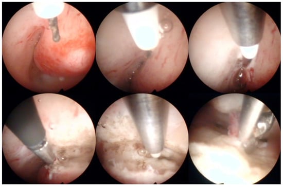 Operative hysteroscopy uses mechanical, electrosurgical, and laser instruments to treat intracavitary pathologies. The introduction of the small-diameter coaxial bipolar electrode (Versapoint, Gynecare, Ethicon, NJ, USA) in 1999 was a milestone for outpatient operative hysteroscopy (Figure 4) [47]. The development of miniaturized mechanical instruments with small diameter scopes and working channels with continuous flow systems enabled the “see-and-treat” approach without general anesthesia [32,34,48,49,50]. Wortman et al. [51] confirmed that major operative hysteroscopic surgery could be performed in an office-based setting resulting in a 98.8% rate of “satisfied” or “very satisfied” patients. Both outpatient (73%) and inpatient (80%) hysteroscopic polypectomy offer comparable success rates, as determined by the patients’ subjective bleeding and QoL assessment after six months [52]. However, procedure failure is higher (19% vs. 7%), and acceptability is lower (83% vs. 92%) with outpatient compared to inpatient polypectomy [52]. An essential aspect of hysteroscopic surgery is a very high level of physician satisfaction (e.g., 95% reported in [53]) associated with this approach. Factors such as incomplete resection and recurrence of the pathology decrease the acceptability of hysteroscopic surgery [38,52].