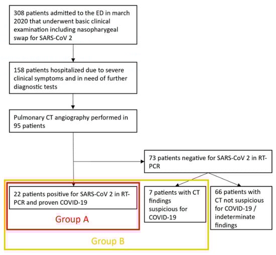 Over the course of one month in spring 2020, 308 patients were treated in our ED for dyspnea with a suspected SARS-CoV-2 infection according to the new COVID-19-specific workflow (Figure 1). A total of 95 patients (female: 34.7% (33/95); male: 65.3% (62/95); mean age: 66.15 ± 17.06 years), who underwent pulmonary CT angiography in the analyzed timeframe at our ED, were included in this retrospective analysis. This study was approved by the institutional review board of the University of Duisburg-Essen (application number: 20-9231-BO, approval date: 7 April 2020). Due to the retrospective nature of this study, informed consent was waived for all patients.