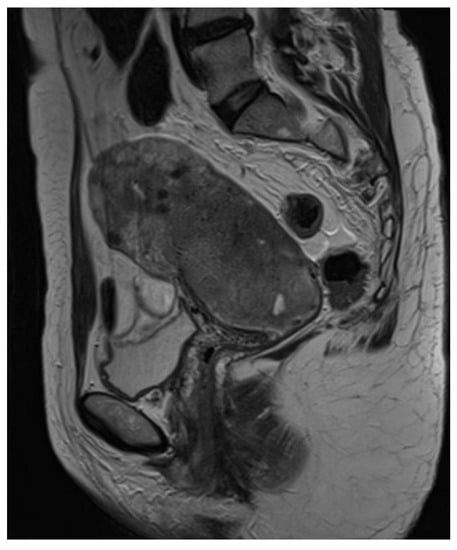 Magnetic resonance (MRI, T2)—sagittal section. Hypersignal tumor 73 mm × 44 mm × 49 mm with apparent neovascularization in the lower uterine body and uterine cervix. The MRI image is suspicious for a sarcomatoid tumor. Intrauterine device in situ. Pelvic lymphadenopathy present.