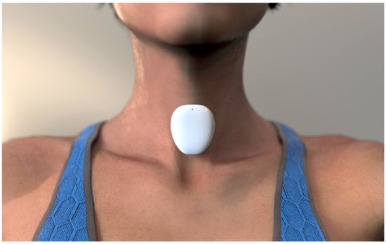 Simultaneously, subjects underwent full night examination with a Clebre audio and motion sensor. The sensor was placed by the technician in the suprasternal notch on the neck and attached using a medical double-sided patch. The way the sensor was placed is presented in Figure 1. The dimensions of the sensor were mm, and it weighed 18 g. The battery allowed for at least 14 h of operation. The memory capacity was defined internally by a 2 GB FLASH chip. Motion accelerometry based signals (3-axis, with a 52 Hz sampling frequency) were used to estimate sleep body position characteristics, using the algorithms presented in a previous study, which reported 97% accuracy in supine versus non-supine body position differentiation compared to the simultaneously acquired PSG []. The sleep studies in which there were differences in estimation of body position between PSG and Clebre were visually inspected by two PSG technicians, using video monitoring. To synchronize the devices, both the Clebre and PSG had an internal clock. It ran parallel to the connected computer (PSG) or was synchronized at the beginning of the study using a dedicated smartphone app (Clebre).