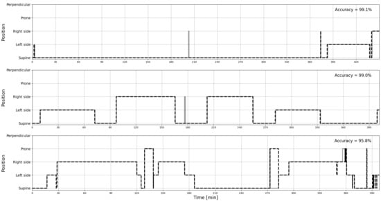 The accuracy in determining supine and non-supine positions was and , respectively. For lateral positions, the accuracy was and for the right and left side, respectively. Paired t tests suggested no basis to reject the null hypothesis (equal means) for left and right side body positions. The prone position was detected with an accuracy of (p-value = 0.0009). The p-value for supine (0.016) showed a statistically significant difference; however, their absolute values were relatively small.