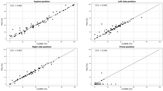 The PSG versus Clebre plots for percentages of each lying body position in relation to sleep time, along with the estimation of Lin’s Concordance Coefficients (CCC).