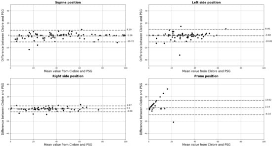 The Lin’s Concordance Coefficients and Bland–Altman curves were also prepared to compare PSG and Clebre percentages of each lying body position in relation to sleep time and are presented in Figure 3 and Figure 4, respectively.