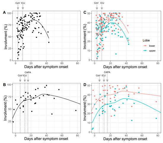 Total lung involvement (A,B) and lobe-wise involvement (C,D) (upper lobe: green line, lower lobe: red line) by days after COVID-19 symptom onset in COVID-19 patients (A,C) and COVID-19-associated pulmonary aspergillosis (CAPA) patients (B,D). Dots show % of affected tissue of individual CTs and the curved lines represent the locally estimated scatterplot smoothing (loess) regression line. The dotted vertical lines (left to right) illustrate median days until detection of SARS-CoV-2 (CoV), ICU admission (ICU) and CAPA diagnosis (CAPA). Chronological changes in the abnormal extent of CT did not differ between COVID-19 and CAPA patients (p = 0.29) for interactions.