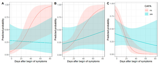 Chronological changes in CT (predicted probabilities) of consolidation (A), crazy paving (B) and ground glass opacity (C) for patients with and without COVID-19-associated pulmonary aspergillosis (CAPA) with corresponding 95% confidence intervals. In early COVID-19 disease, consolidation was associated with CAPA, whereas ground glass opacity was less common.