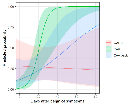 Chronological changes in CT (predicted probabilities of consolidation) with corresponding 95% confidence intervals for patients with COVID-19-associated pulmonary aspergillosis (CAPA), COVID-19 without bacterial superinfection (CoV) and COVID-19 with bacterial superinfection (CoV bact.). In early disease, consolidation is most common in CAPA patients and more common in COVID-19 patients with bacterial superinfection compared to patients without bacterial superinfection.