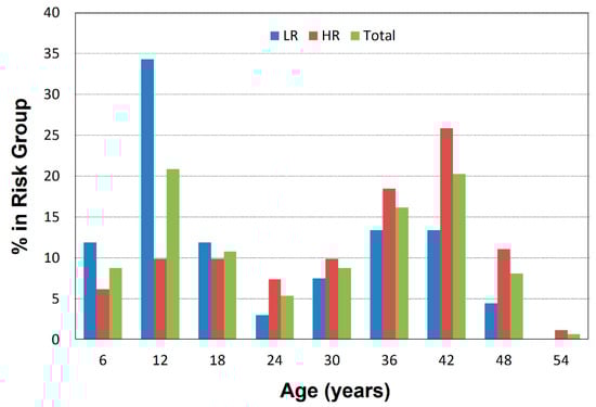 The distributions of ages in each risk group were similar, except for a larger proportion of school-aged children in the low-risk group (Figure 1).