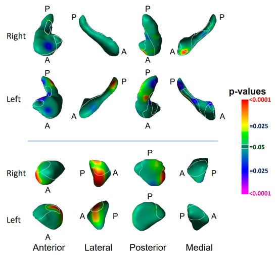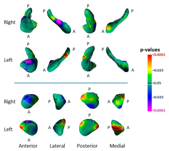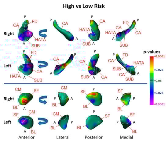 Surface analyses detected the effect of risk group as inward deformations in the head of both hippocampi and the anterior surface of the left amygdala, and protrusions of the lateral body of the left hippocampus and the anterior and dorsal posterior aspect of the right amygdala (Figure 2).