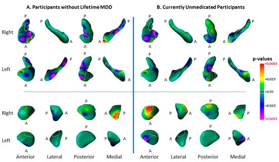 Risk-group Effect Distinct from the Effect of Lifetime Major Depressive Disorder and Medication Use. Panel (A): The risk-group effect (32 HR vs. 55 LR) is shown when excluding all participants who had a lifetime history of MDD. Findings for the hippocampus are very similar to the effects when including all participants (Figure 1 of the main text), demonstrating that the surface morphological features for that structure are genuine risk effects, as they are detected in offspring of persons with MDD but who, themselves, have never had depressive illness. Many of the findings in the amygdala shown in Figure 1 of the main text, however, are not statistically significant in this subgroup analysis, either because those effects derive from the effects of lifetime MDD or because of the reduced statistical power in this analysis because of the smaller numbers of participants in this subgroup analysis. Panel (B): The risk-group effect (57 HR vs. 59 LR) is shown when excluding all participants who were taking psychotropic medications at the time of MRI scanning. The effect of risk group is similar to the effects detected when including all participants (Figure 1). These findings demonstrate that the risk effects reported Figure 1 are independent of medication effects. The statistical models included the main effect of risk group, and the covariates of age, age2, and sex. p-values are thresholded at p = 0.05 after FDR correction for multiple comparisons.