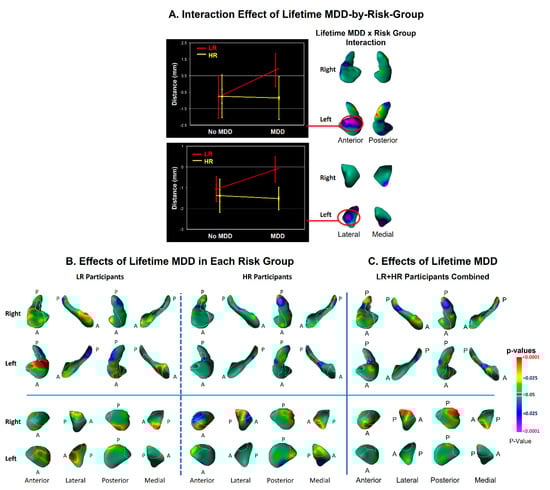 We detected significant interactions of risk group with lifetime MDD in the dorsal head of the left hippocampus and lateral surface of the left amygdala (Figure 5) that derived from protrusions at those locations in low-risk participants with a lifetime history of MDD (Figure 5).