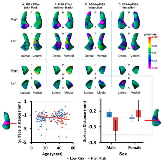 Sex significantly moderated the effect of risk in portions of the head body of both hippocampi and lateral surface of the left amygdala (Figure 6). The interaction of sex with risk group in those locations derived from greater indentations in males of the high-risk group than in other participants (Figure 6). When masking out these regions of significant interaction for age and sex, the main effect of risk group remained in the anterior head of both hippocampi and the anterior and medial surfaces of the left amygdala (Figure 6).