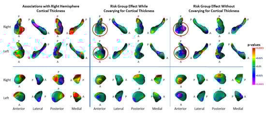 Associations of Right-Hemisphere Cortical Thickness with Surface Morphologic Features of the Hippocampus and Amygdala. Left Panel: The statistical significance (p-values) for the associations of an index for right-hemisphere cortical thickness with surface measures on each structure are shown. Significant positive associations are in warm colors. Inverse associations are in cool colors. The index for right-hemisphere cortical thickness was calculated by averaging cortical thickness measures at each voxel within the voxels of the lateral surface of the right hemisphere, where thickness differed significantly between the high and low-risk groups. Statistical models included the independent variables cortical thickness, risk group, age, age2, and sex. Associations are shown for high- and low-risk groups combined (HR (64) and LR (65)). Middle Panel: This shows the effects of risk group while covarying for the average cortical thickness in voxels of the cortex where thickness differed significantly between risk groups, as well as covarying for age, age2, and sex. Right Panel: For ease of comparison with the middle panel, this shows the same effects without covarying for cortical thickness (also shown in Figure 1). The magnitude of cortical thinning accounted for most of the variance of the risk-group effect for indentations in the hippocampus (red circles), but not in the amygdala. Number of participants: covarying for cortical thickness—HR 63, LR 65; without covarying for cortical thickness—HR 81, LR 67.