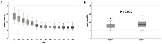Image noise at different keV levels on the PCD-CT (A). Image noise on the PCD-CT (70 keV) and the EID-CT (B). * denotes an outlier value.