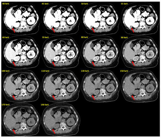 Example of PCD-VMIs (40–190 keV) in a patient with hypovascularized liver metastases of pleura mesothelioma. Hypovascularized metastasis in segment VI (arrow).