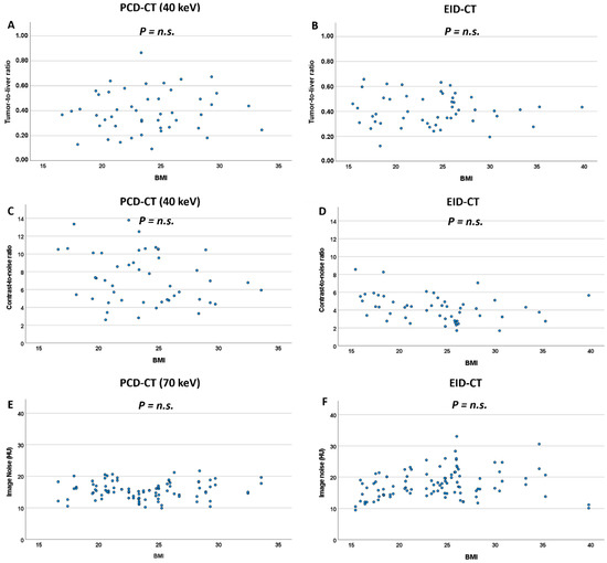 Scatterplots for TLR (A,B), CNR (C,D) and image noise (E,F) against BMI for the PCD-CT and EID-CT system. n.s.: non significant.