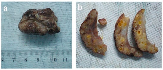 Macroscopic aspects (a) tumor after the en-block removal; (b) the cut surfaces of the resected tumor.