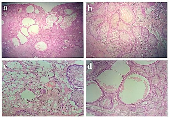 Histologically, paraffin sections stained with hematoxylin and eosin showed a microcystic appearance with numerous sebaceous glands, with various dimensions, embedded in stromal fibrosis (Figure 3a,b). Occasionally, the glandular structures are dilated and contain sebaceous material (Figure 3c,d).