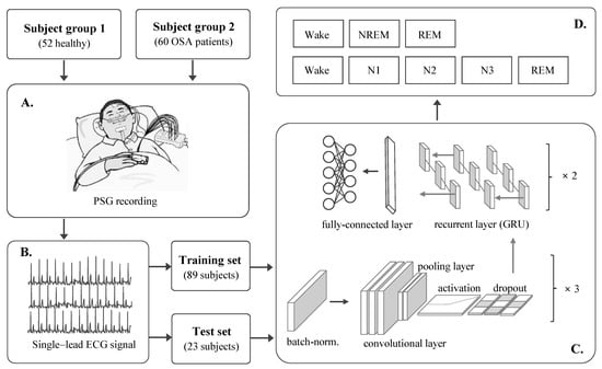 Schematic diagram of this study. (A) Study population and PSG study, (B) ECG dataset, (C) DCR model, and (D) target sleep stages.
