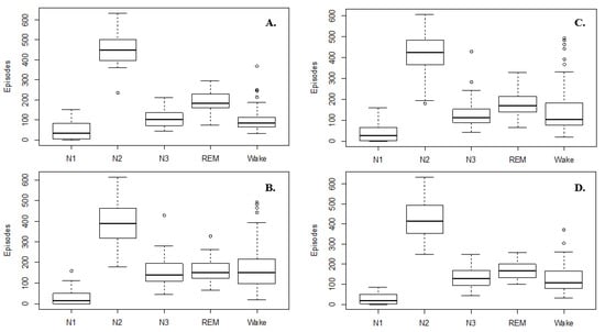 Distribution of sleep structure for (A) control group, (B) OSA group, (C) training set, and (D) test set, ° is represented outliers.
