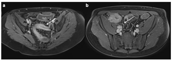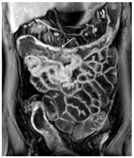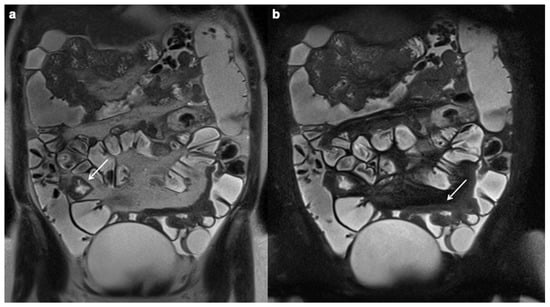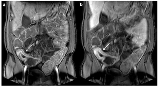 Intramural edema, or mural edema, is detected as a hyperintense signal of the intestinal wall on fat-suppressed T2-weighted images or low b-value (i.e., a b value of 0–20 s/mm2) of DWI [135,159]. Intramural fat, which may be the result of previous intestinal inflammation, also shows high signal intensity on T2-weighted images, but differs from edema by losing signal intensity with fat-suppressed weighted sequences. Intramural edema is better evaluated on MRE because of its high contrast resolution than on CTE [41] (Figure 3).