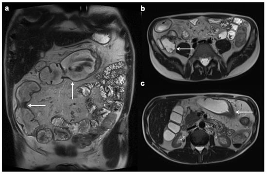 Stricture with upstream dilation (white arrows). Coronal (a) and axial (b,c) T2 FSE without FS MRE demonstrate ileal and transverse colon stricture with respectively mild (3–4 cm) and severe (>4 cm) upstream dilation.