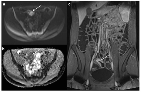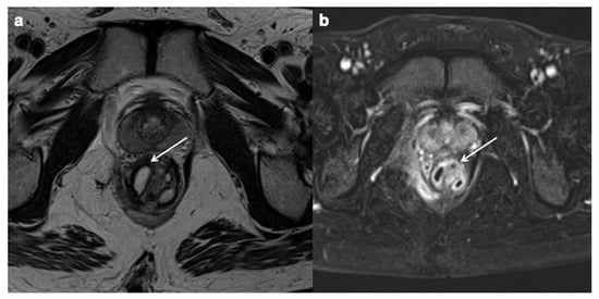 An abscess is a fluid collection bordered by well-defined thickened walls and characterised by contrast graphic enhancement on contrast-enhanced MRE, as opposed to an inflammatory mass. Internal gas may or may not be present within the fluid formation. Abscesses may be found within the mesentery, peritoneal cavity, retroperitoneum, body wall, or perirectal and/or perianal region (Figure 12). Abscesses usually in diffusion sequences show limited diffusion with high signal intensity on high b-value images (i.e., a b-value of at least 500 s/mm2) and low signal intensity on the corresponding ADC maps. As already mentioned, weighted DWI sequences represent one of the reference sequences for the evaluation of CD, and are fundamental in those patients with a contraindication to intravenous contrast material infusion [190]. Also in this case, the diffusion study has shown similar results compared with the post-contrast images regarding the complication’s detection. There are several studies evidencing that the T2w images associated with diffusion study can actually be used for the study of complications, even without the use of contrast [191,192].