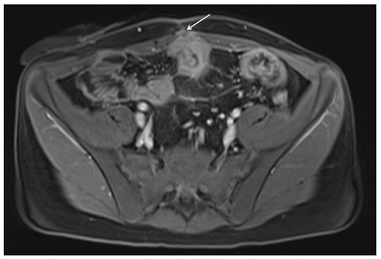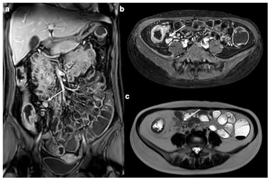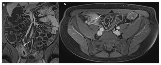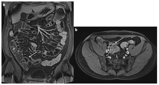 Ulceration is another finding associated with active inflammation. Ulceration consists in a rupture of the intra-luminal surface of the intestinal wall with extension of the endoluminal contents into the wall, a finding that is clearly visible in MRE with the use of oral contrast medium [171,172]. Unlike the sinus tract, which extends outside the wall to involve mesenteric fatty tissue, in the ulcer, the defect is confined to the bowel wall. Commonly known also as “penetrating ulcer”, this term should be avoided in the radiological report as it could create confusion with penetrating disease (e.g., a fistula or a sinus tract) or a pathological cardiovascular disease (Figure 5).
