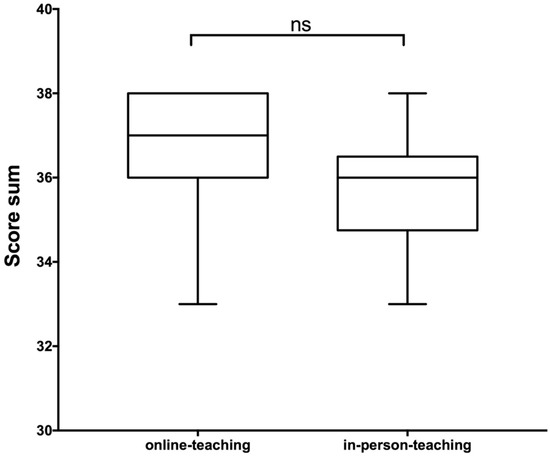 In the web-based course, participants improved from a median score value of 15.5 pre-course to a median score value of 28.5 after the training session. Regarding self-assessment, the group taught in face-to-face form showed an increase in the median score from 13 before to 28.5 after the training session. A significant difference in self-assessment after course participation between the two groups could not be found. Regarding the evaluation by the senior physician, we observed high score values in both groups. There was a slightly higher median score value reached by the video-based course (37) compared to the in-person class (36), but the overall scores in both groups did not differ significantly (Figure 4).