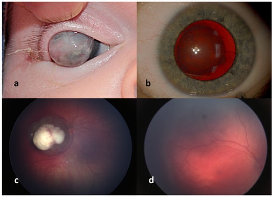 Examples of ocular diseases in infants: corneal dysgenesis (a), congenital cataract (b), early diagnosed Group B intraocular retinoblastoma (c), retinopathy of prematurity stage 2 in zone I and posterior zone II with plus disease (d).