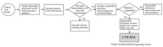 Follow-up care of patients in the community is an important topic for improving patient outcomes, especially when medical personnel receives a notification of the critical test result (CTR) when the CTR becomes available after patients have been out of hospital; how to recall the patient back to the hospital and follow-up treatment is essential for preventing the healthcare risk of neglecting or delayed intervention with respect to the patient’s CTR. We are concerned that the follow-up of CTR and timely recall of our patients in the community improves and facilitates patient safety. We built the CTR Recall Supporting System (RSS) to follow up and recall our patients in the community. Measures were introduced to evaluate the effectiveness of CTR RSS; the rate of return of patients within 7 days increased from 58.5% to 88.8%, an increase of 30.3%, the patients in the community’s return follow-up interval days decreased from 10.9 days to 6.2 days, reduced by 4.7 days (p < 0.001), and the mortality rate of the patients in the community within 48 h decreased from 8.0% to 1.9%, a decrease of 6.1%, p < 0.001. The implementation of the CTR RSS significantly increases the discharged patient in he community’s CTR return follow-up within 7 days rate, decreases CTR return follow-up interval days, and reduces the CTR mortality rate within 48 h. This effectively improves the effects of CTR on return follow-up visits and provides a prototype system for hospitals that intend to improve this issue.