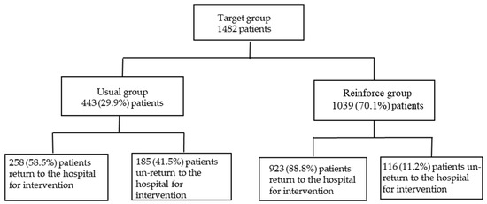 The target group is the patients in the community when CTR becomes available after patients have been out of the hospital from July 2019 to April 2021. The hospital completed the conversion of communication devices in July 2019, but the CTR RSS had not been activated. Taking into account the completeness and validation of the data, we used July to December 2019 as the 6-month observation period for the baseline (usual group). CTR RSS was launched in January 2020, with a 16-month implementation period (reinforce group) from January 2020 to April 2021; patient death discharges were excluded from the groups. We compared the two groups on return and unreturning follow-up measures (as shown in Figure 2).
