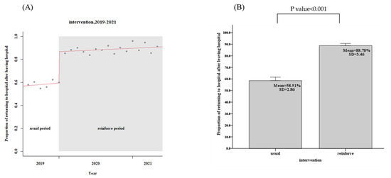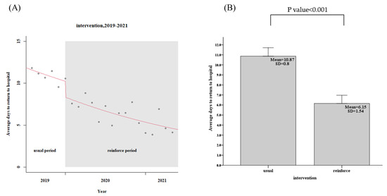 Patients in the community CTR return follow-up interval days (usual group vs. reinforced group). (A) Trends, (B) Average values.