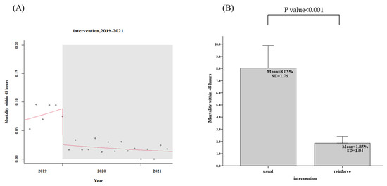 Patients in the community CTR mortality rate within 48 h (usual group vs. reinforced group). (A) Trends, (B) Average values.