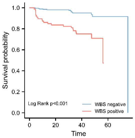 The Kaplan–Meier test was performed to evaluate prognostic factors including age, gender, tumor diameter, multifocality, capsular infiltration, extra thyroidal extension, LNs metastasis, Tg, TGAb, US before ablation, and WBS results. Patients with RAI-avid mLN had a poor prognosis as compared with those with non-RAI-avid lesion (p = 0.000). The log-rank test data are listed in Table 3. The median survival time of WBS results was 56.17 months for the RAI-positive and 75.27 months for the RAI-negative.