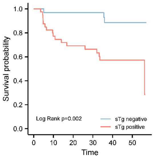 We further investigated the prognostic value of sTg in the Rx SPECT/CT positive group. The result showed that the patients with RAI-avid but sTg-negative nodes have a better prognosis than those who revealed RAI-avid and sTg-positive nodes (p = 0.017). The 131I-detectable mLN with negative sTg had a significantly better chance to be eliminated by initial RAI. While RAI-avid nodes with elevated sTg had a higher chance of harboring tumor cells demonstrating heterogeneous radiosensitivity, this might be an origin for future recurrence, as mentioned above [].
