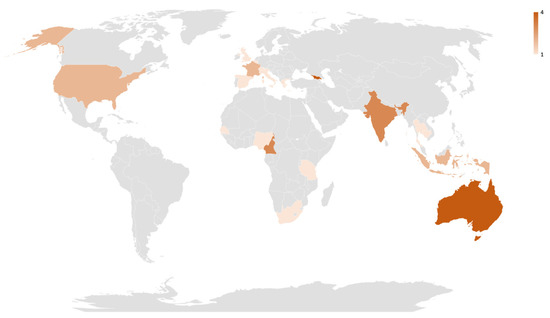 Geographic distribution of countries from 25 studies included within the review (shaded in red). WHO regions: Africa—Cameroon (n = 3), Nigeria (n = 1), Senegal (n = 1), South Africa (n = 1), and Tanzania (n = 1). Americas—the United States (n = 2). Europe—Belgium (n = 1), France (n = 2), Georgia (n = 4), Greece (n = 1), Italy (n = 1), Spain (n = 1), Switzerland (n = 1), UK (n = 1), and Ukraine (n = 2). South-east Asia—India (n = 3), Indonesia (n = 2), and Thailand (n = 1). West Pacific—Australia (n = 4), Cambodia (n = 1), and Malaysia (n = 1).