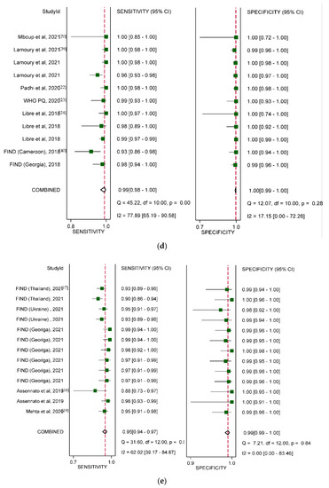 Genedrive HCV ID kit: Six studies (nine data sets) based on 2470 samples collected in eight countries between 2017 and 2019 were included in the meta-analysis of the Genedrive HCV ID kit, which only utilizes plasma samples (Table 1). The pooled sensitivity and specificity were 99% (95% CI: 98–100%) and 100% (95% CI: 99–100%), respectively (Figure 4d). Five data sets were from five countries in Africa (three countries) and three data sets from Europe (33.3%). There was also one data set collected from India. Specificity was slightly higher in frozen samples than in fresh samples (100% vs. 99%, p < 0.001).