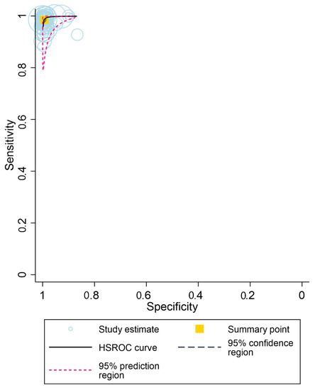 Hierarchical summary receiver-operator curve for the diagnostic accuracy of point-of-care HCV RNA assays used to diagnose chronic HCV infection. (Overall, with all studies combined).