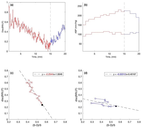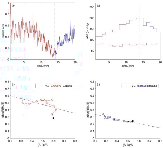 First, we look at how the heart rate and systolic and diastolic blood pressure readings vary over time throughout the load and recovery phases of a bicycle stress test in one person with normal ABP and one person with high ABP. The plots in red color depict the data during the load process, while the plots in blue depict the data during the recovery process, and the black dashed line indicates the end of the load process and the beginning of the recovery process. Figure 3 represents the case of an individual with normal ABP in the first plot; Figure 3a shows the variation in Disc RR/JT vs. time (in minutes). As we can see, there is an increase in Disc RR/JT in the first few minutes of activity, which is quite typical for a person with normal ABP. This could indicate that the person’s body is attempting to restructure its condition in order to find the optimal amount of physiological function organization while under load. In the case of small loads, this is a common reaction for a person with normal ABP. Later, as the load increases, the Disc RR/JT decreases until it reaches a minimal value at the maximum load, indicating a maximal decrease in complexity, when the main task of the organism is to concentrate all systems’ potential to develop maximal muscle function and power to achieve the goal. When the load is removed, we see the complex restoration of Disc RR/JT to its original state. Figure 3b depicts the systolic and diastolic pressure readings during a bicycle stress test. Because the individual has normal ABP, his blood pressure measurements are very normal throughout the duration of the exercise. Figure 3c,d show the phase plane representation of the arterial blood pressure’s relative pulse amplitude during the load and recovery process, with (S − D)/S on the x-axis and Disc RR/JT on the y-axis. A full filled circle on the phase plane graph indicates the end of the load and beginning of the recovery process during the bicycle stress test. The linear regression built throughout the load and recovery phases helps us compute the slope coefficients for this specific person, which are −0.42087 for load and −0.31606 for recovery. It is also worth noting that the trend line coefficient values make sense, as the decrease in Disc RR/JT occurs at the same rate as the increase in relative pulse amplitude (S − D)/S.